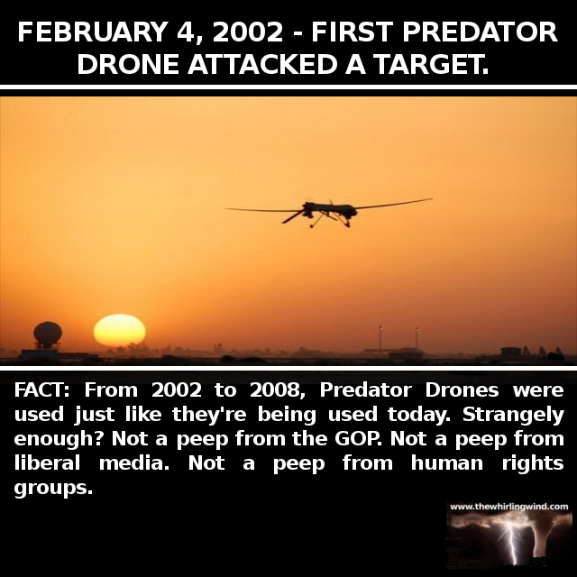 This latest fiasco deals with the use of Predator Drones. Who needs the Republican party when we are so insistent on shooting ourselves in the foot? From February 2002 up through the end of he Bush Presidency in 2008, Predator Drones were used to good effect. Yes, President Obama increased their use, however the protocols and methodology remained the same. If a Predator Drone gets shot down, malfunctions or crashes, we don’t lose American military personnel. No rescue missions to retrieve an American airman stranded in hostile territory. It is just an expensive piece of military equipment. No piece of equipment is more precious than the life of a son, daughter or father serving in a theater of war.