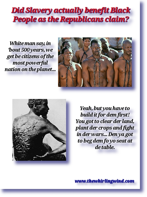 Did Slavery actually benefit Black People? This silly narrative resurfaces from time to time, promoted by racist white people whom ironically enough, never seem to say this in the presence of Black people unless they’ve got security and strength in numbers close at hand. Presupposing this notion indicates not only an ingrained sociopathic racism, it reveals a paucity of historical knowledge and American history in particular. One might just as easily – in the spirit of a free exchange of ideas of course – ask if the Jewish Holocaust benefited the Jews? After all, they got the “Nation of Israel” out of the deal?