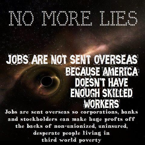 Let’s say you’re retired and living happily on your pension and Social Security. The Social Security fund is set up on the premise that people who are currently working and paying their Social Security are funding the program for you. As more and more jobs are transferred out of the country, the Social Security fund will shrink. This is true for Medicare as well. No matter where you are, where you live, you are affected by factories closing and those jobs being sent to other countries. Even if you’re self-employed, you’re affected.