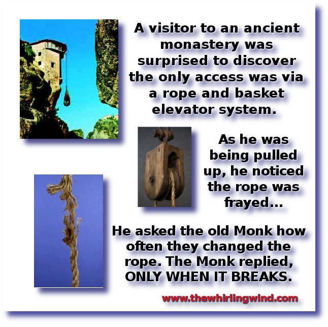 A traveller visiting an ancient monastery was surprised to discover that the only access was by an elevator up the side of the cliff in a basket pulled up by a rope. As he rode up he noticed that the rope was frayed. He turned to the old Monk and asked how often they replaced the rope? The Monk replied, “each time it breaks.” This describes the way we currently handle business.