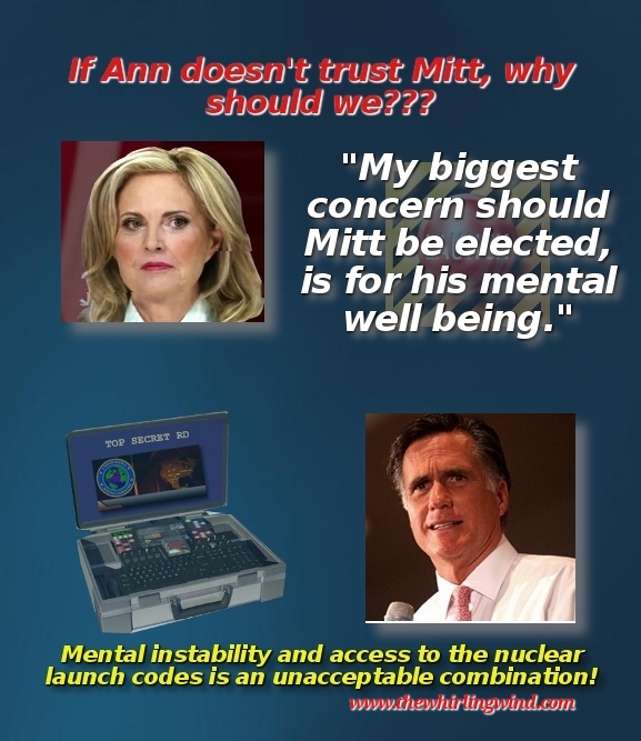 If Ann Romney is concerned, we should be too. The office of the Presidency of these United States is not some trophy you feel you’re owed. It is not the icing on the cake for an over padded résumé. You hold in your hands, not only the lives of every American, but the billions of lives around the globe. It would be nice to know that the person holding those lives, was a person who actually gave a damn! More importantly, it would be nice to know that their mental health was not in question and that their word actually meant something.