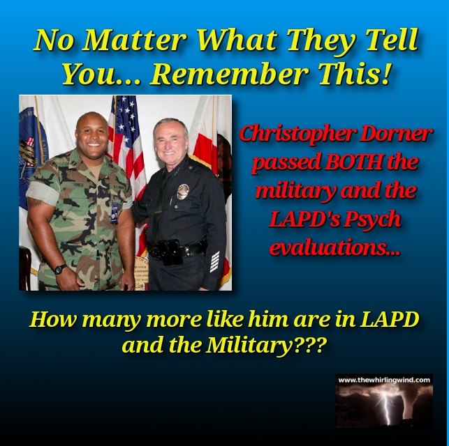 Clearly what LAPD is doing is laying the ground work to justify murdering Christopher Dorner rather than bring him to justice. The question I have is why? This is a question that you and everyone else ought to be asking as loudly and as often as possible. What does he know? What might he say in open court that the LAPD would prefer him never to reveal in open Court? Are they justifying murder ahead of time? It seems to me that they are.